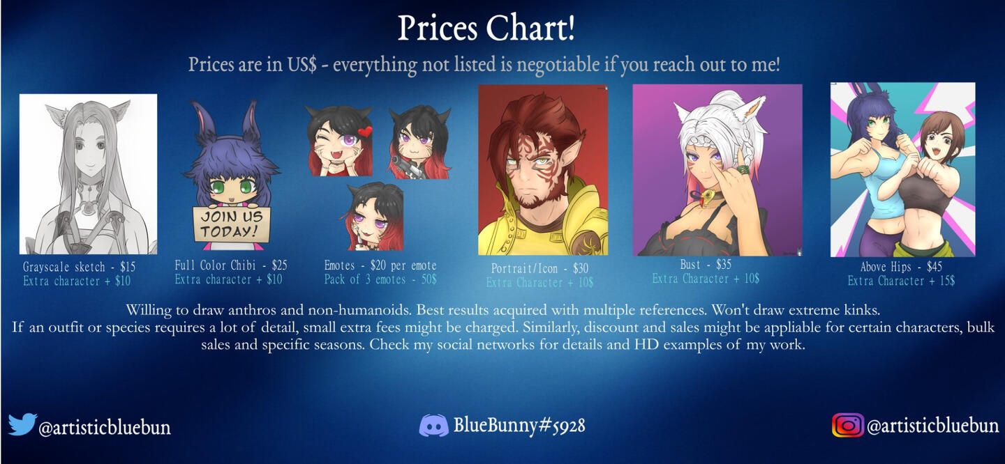 Commissions are open! If you need anything or have any questions please contact me via IG, Twitter, or through discord @ BlueBunny#5928